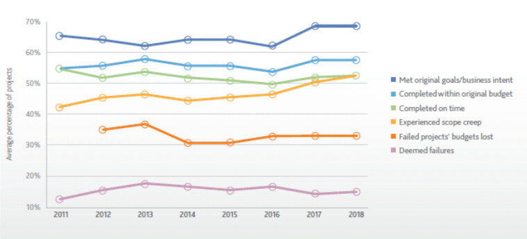 The larger and more complex the project, often the poorer the record of success. Figure 1 (below) from the Project Management Institute (PMI)1 indicates that less than 60% of all projects are completed on time and within the original budget. This has remained consistent over many years, as has the deemed failure rate of around 15%.